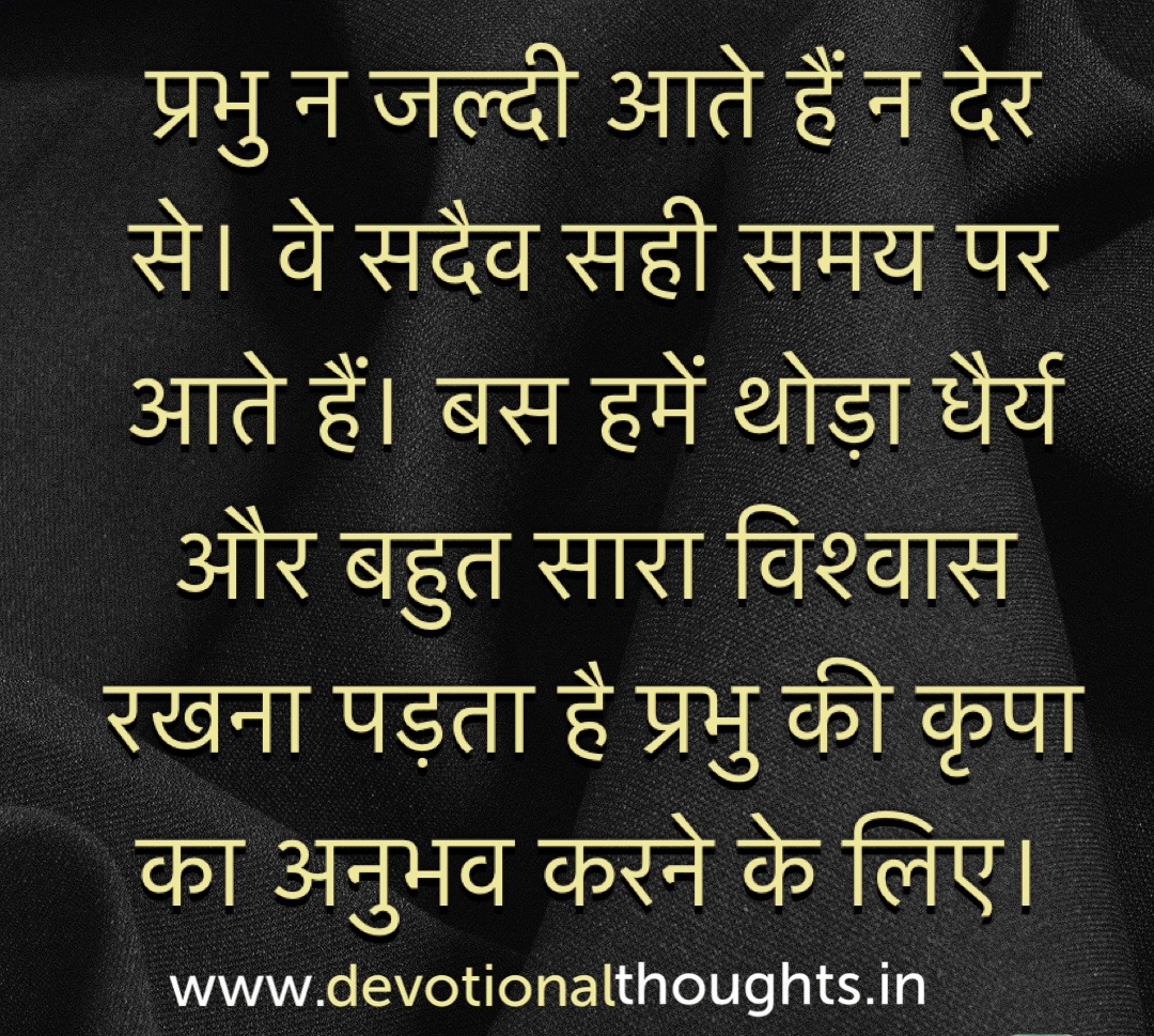 प्रभु न जल्दी आते हैं न देर से । वे सदैव सही समय पर आते हैं । बस हमें थोड़ा धैर्य और बहुत सारा विश्वास रखना पड़ता है प्रभु की कृपा का अनुभव करने के लिए ।